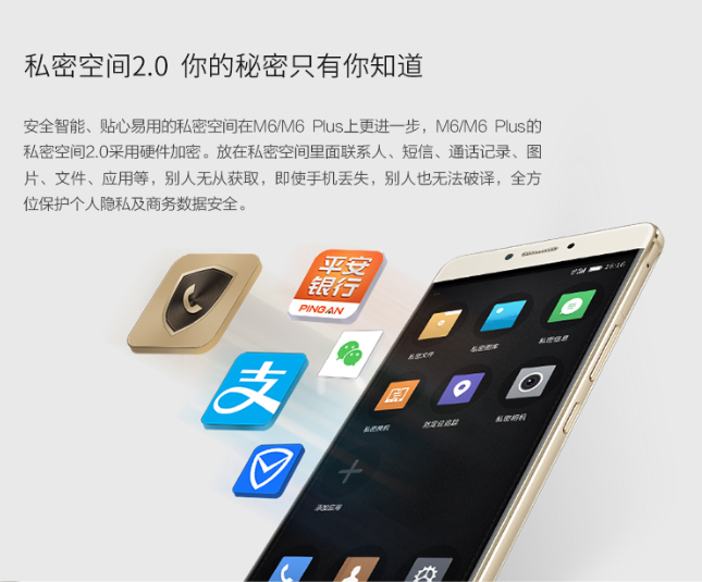 M6/M6 PLUS的私密空間2.0采用硬件加密算法,放在私密空間里的信息就算手機丟失別人也無法破譯,全方位保護個人隱私及商務(wù)數(shù)據(jù)安全。