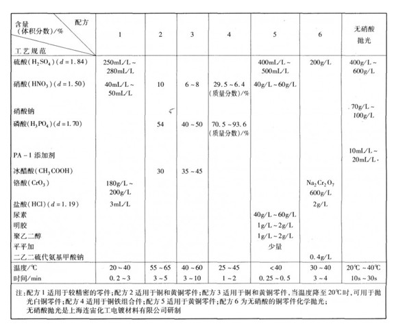 銅和單相銅合金,可以在磷酸.硝酸.醋酸或硫酸.硝酸.鉻酸型溶液中進行化學(xué)拋光。其工藝規(guī)范列于表2—4—5。